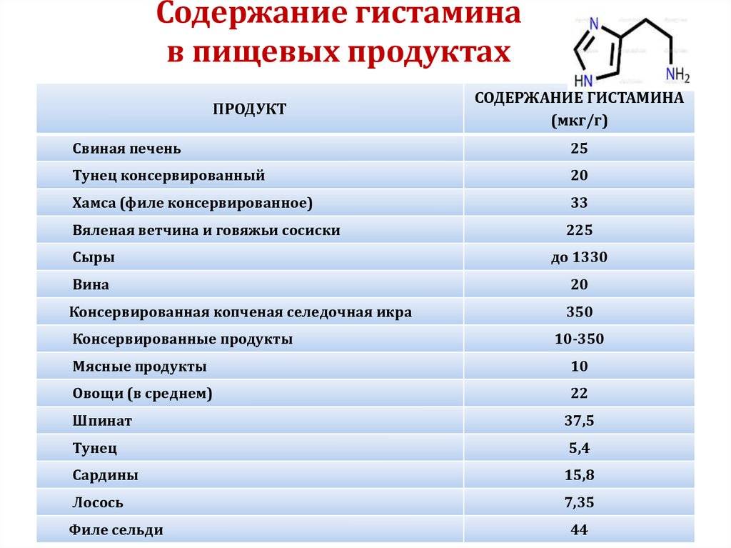 Все продукты делятся на две группы, некоторые из них активируют гистамин в организме, другие сами содержат большое его количество. Наличие в них тканевого гормона отображено в таблице: