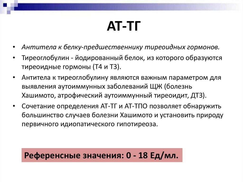 По неизвестным причинам тиреоглобулин начинает восприниматься иммунной системой как чужеродный объект. В ответ к нему синтезируются аутоантитела, вследствие чего в железе возникает воспаление. Высокий уровень антител к ТГ является точным показателем аутоиммунных патологий у женщин и мужчин – тиреоидита Хашимото, Базедовой болезни.