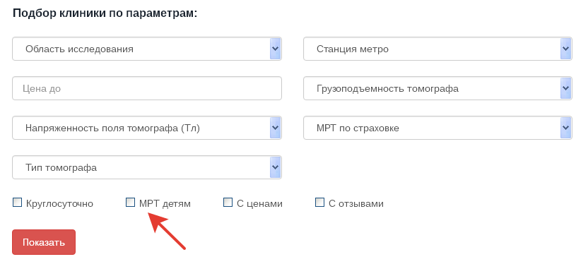 | Скриншот фильтра для поиска клиники по необходимым параметрам |