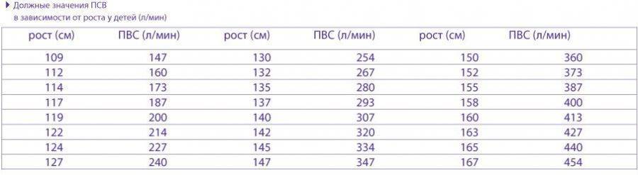 В связи с тем, что у детей норма ПСВ определяется, опираясь на их рост, созданная таблица значений существенно отличается от взрослой, в которой указывается больше параметров. Чтобы узнать норму пикфлоуметрии для ребенка, следует отыскать в таблице его рост и, следовательно, напротив этой отметки будет указан ПСВ. Не стоит ожидать, что внесенные показатели в таблице будут в точности соответствовать полученным результатам.