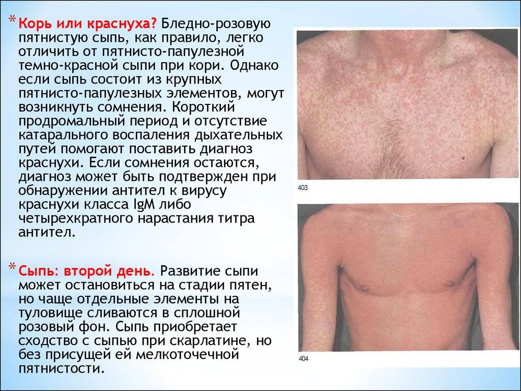 При краснухе у детей практически никогда не бывает высокой температуры. Это заболевание малыши переносят легко, хотя мелкопятнистая сыпь и увеличенные задне-шейные лимфоузлы наблюдаются при обеих инфекциях. Перенесенная краснуха определяется наличием специфических антител в крови ребенка4