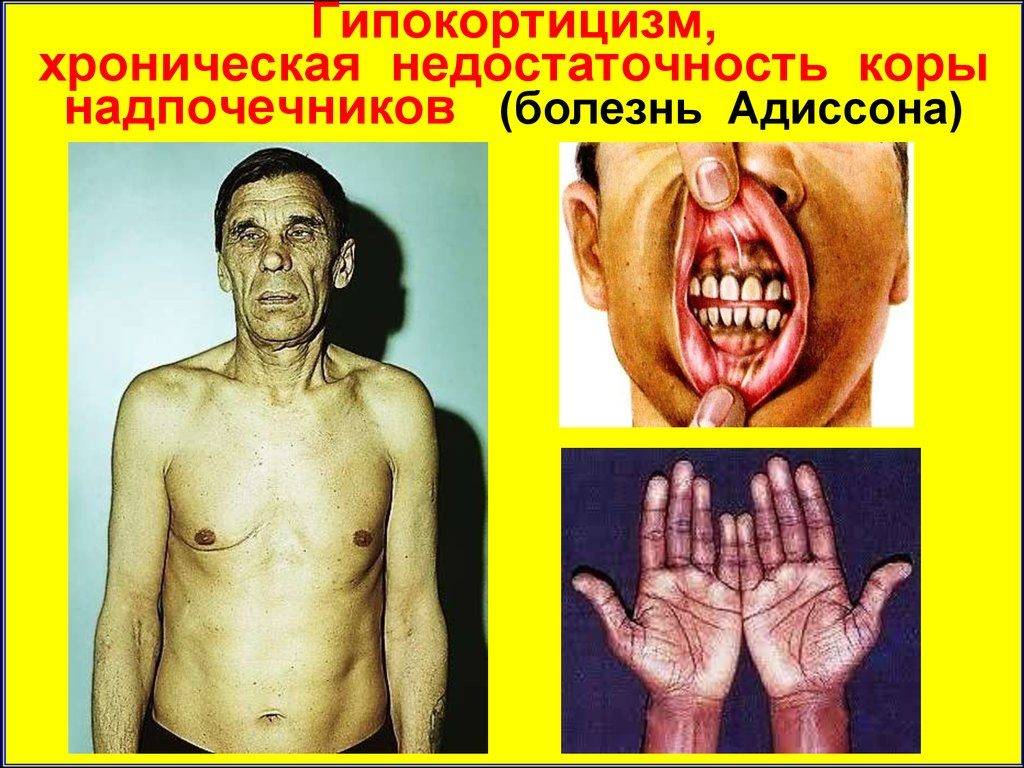 - Заболевания, вызванные ограниченным продуцированием активных веществ – в данную категорию относят острый тип недостаточности желез, вторичную и первичную ее форму (болезнь Аддисона).
