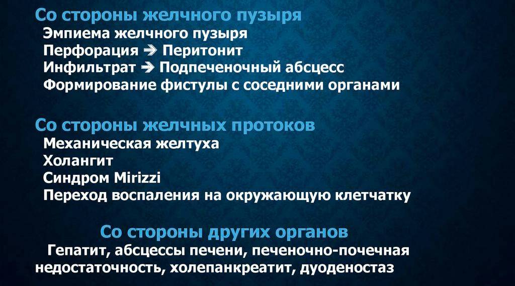 Последствиями заболевания могут быть некроз стенки желчного пузыря, образование камней в протоках, перитонит.