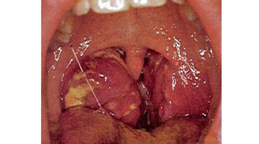 Флегмонозная ангина — обычно развивается как продолжение фиброзной формы. Пациента беспокоит резкая невыносимая боль в горле, которая чаще всего бывает односторонней. Больному тяжело открывать рот, разговаривать, голос становится гнусавым. Появляется специфический запах изо рта, напоминающий запах ацетона. Температура повышается до 40 C. Миндалина покрыта серовато-желтым налетом, отечна, на ощупь болезненная.