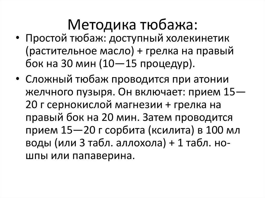 Врачом тюбажи назначаются с целью устранения холестаза, выведения застойной желчи. Эту процедуру часто включают в лечение хронического холецистита, дискинезии желчных путей по гипотоническому типу, при гепатозе, глистных и паразитарных инвазиях.