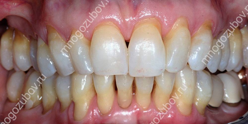 - нарушения прикуса. Неправильно расположенные зубы нарушают кровоснабжение кортикальной ткани, что приводит к ее атрофии, а затем и опущению десны. Наиболее велик риск при глубоком прикусе (при котором верхние резцы более чем на треть перекрывают нижние) и открытом прикусе (при котором передние резцы не смыкаются);