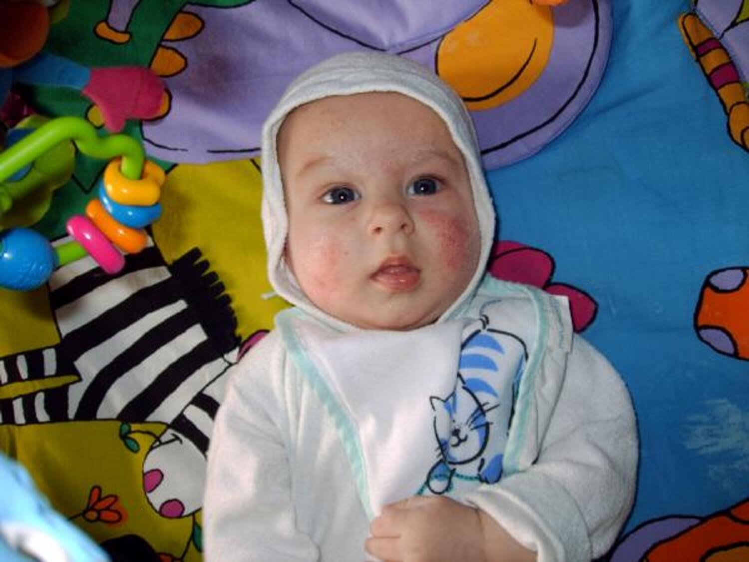 У младенцев болезнь начинается с нескольких недель и проявляется в виде покраснения и сухости кожи на щеках и наружных сторонах конечностей. Примерно с трёх месяцев у малыша может появиться зуд и как его следствие нарушение сна.