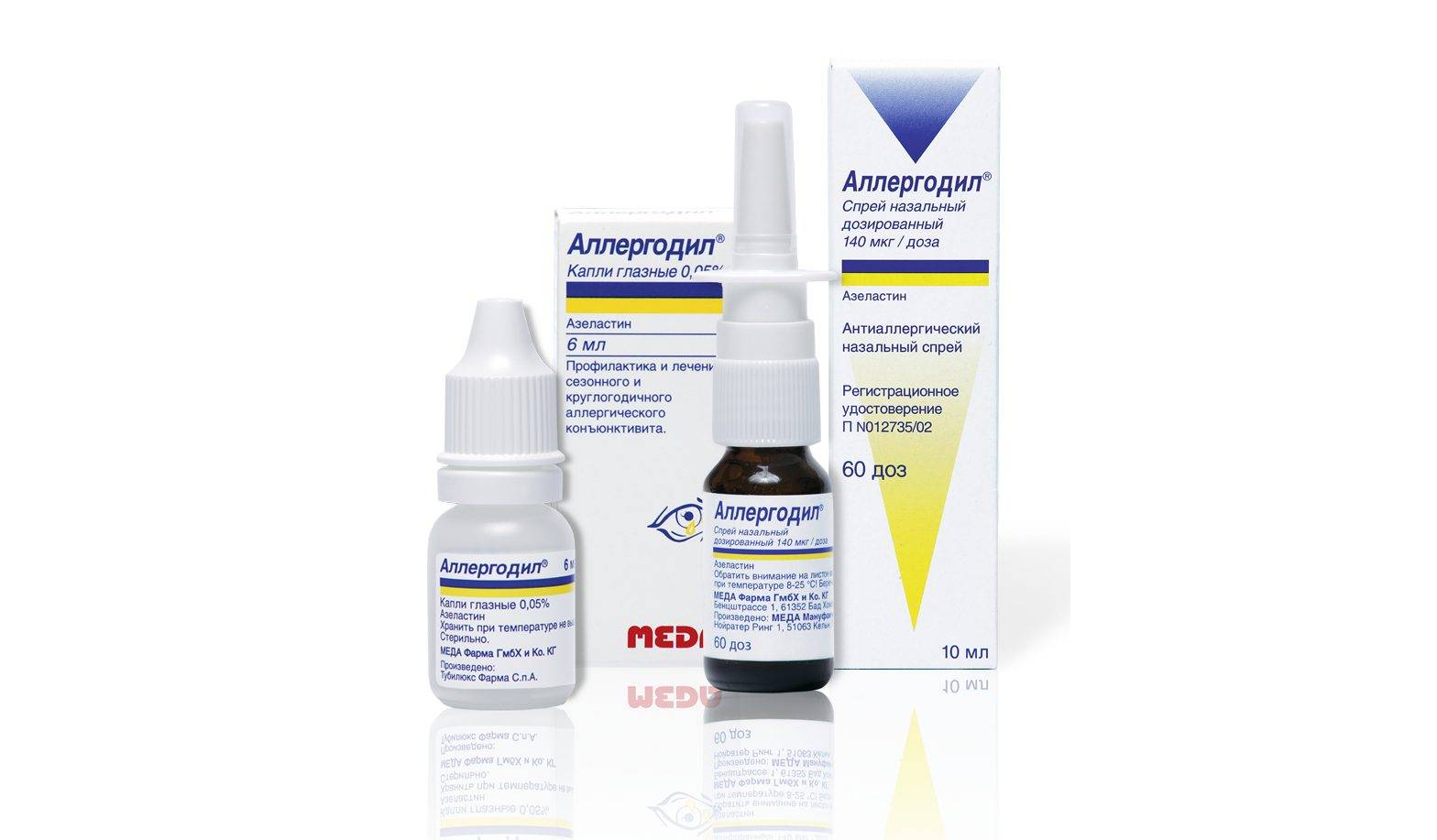 Форма выпуска – дозированный спрей, флакон содержит 10 мг азеластина гидрохлорида. Предназначен для борьбы с сезонной аллергией, риноконьюктивитами, круглогодичным неаллергическим насморком, уменьшает зуд, чиханье и обильное течение из носа.