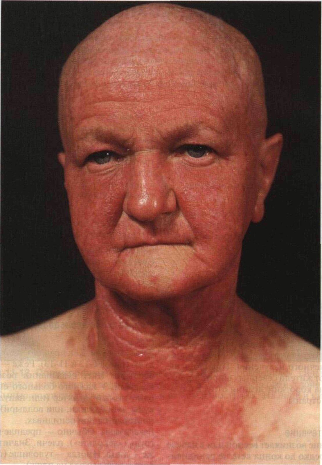- Хронический актинический дерматит — воспаление кожи от воздействия излучения (солнце, УФ-излучение от ламп, радиационное). Проявляется в покраснении, отечности с зудом, жжением. После переходит в шелушение. При тяжелой форме возникает точечное кровотечение, некроз, образование утолщений, рубцов.