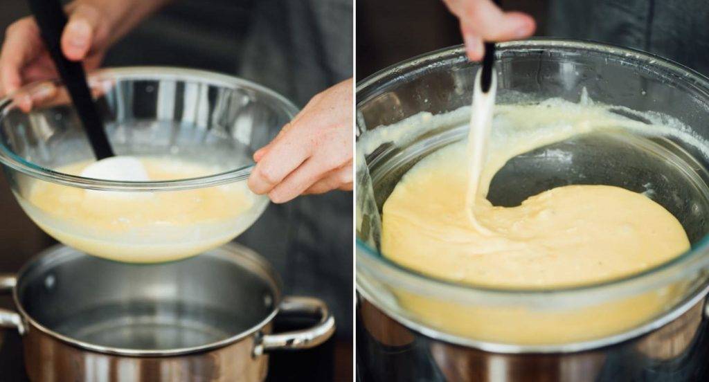 - Сотейник опустите в кастрюлю с умеренно кипящей водой и готовьте 20 мин. до состояния воздушного омлета.