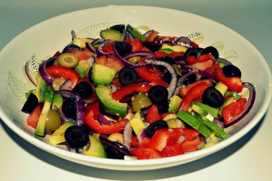 Хорошо помойте помидоры и нарезаете их дольками. С помытого перца вынимаете сердцевину и режете на прямоугольники, после чего соедините с порезанными помидорами в салатнице. Оливки нужно отжать и добавить к помидорам и перцу. Можете оливки порезать, а можете оставить их и целыми. Помытую зелень мелко порежьте и добавляете в салат. Все хорошенько перемешайте, добавьте немного соли и заправьте блюдо оливковым маслом.