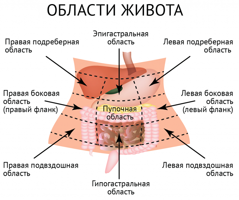 Вероятно также ее появление в области тонкого кишечника. Именно в нем больше всего рецепторов ACE2, которые подвержены влиянию возбудителя. По мере распространения инфекции живот при коронавирусе болит уже и в области толстого кишечника, то есть справа от пупка. Дискомфорт может ощущаться и под ребром.
