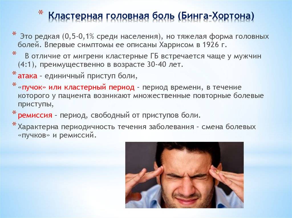 Заболевание поражает взрослых по окончании полового созревания (от 20 до 50 лет). Начаться расстройство может беспричинно в любое время. Сигналом кластерных болей могут стать вспышки света перед глазами и закладывание уха. К основным симптомам такого вида цефалгии относят: