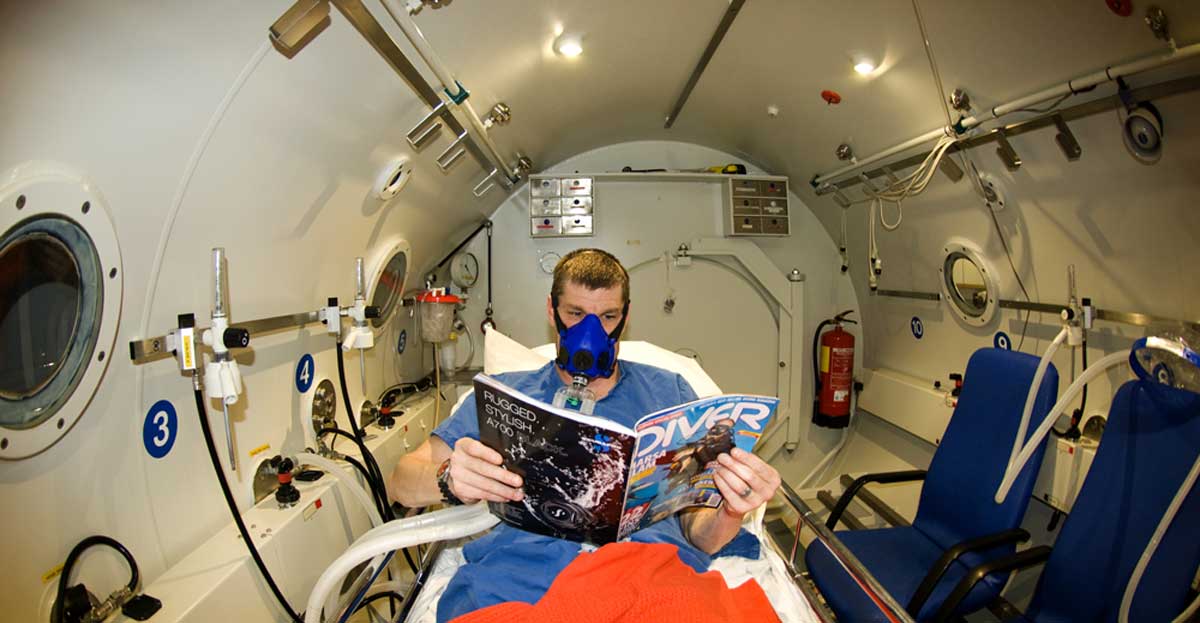 Барокамера медицинская — это медицинское оборудование, внешне похожее на батискаф. В барокамеру клиент помещается лежа или сидя, ему нужно всего лишь находиться там и вдыхать воздух, обогащенный кислородом. Давление и концентрация кислорода внутри камеры контролируются датчиками и специальными клапанами. За этими показателями следит врач или другой специалист. В барокамере создаются условия, похожие на погружение примерно на пять-десять метров ниже уровня моря. Во время процедуры возможна заложенность ушей. Гипербарическая оксигенация проводится курсом – от 10 до 40 процедур. Продолжительность одного сеанса от двадцати минут и до одного часа.