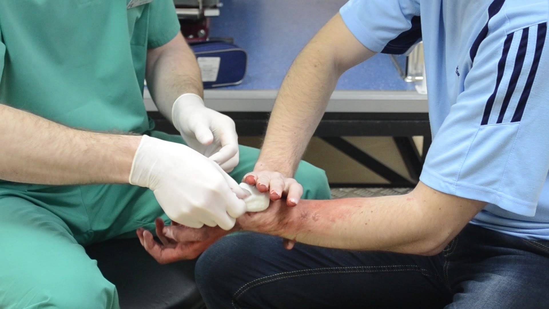 Давящая повязка при этом накладывается следующим образом: на рану накладывается слой марли, сверху валик из скрученного бинта. После этого он приматывается к шине или приподнятой руке, которые расположены с противоположной стороны от ранения.