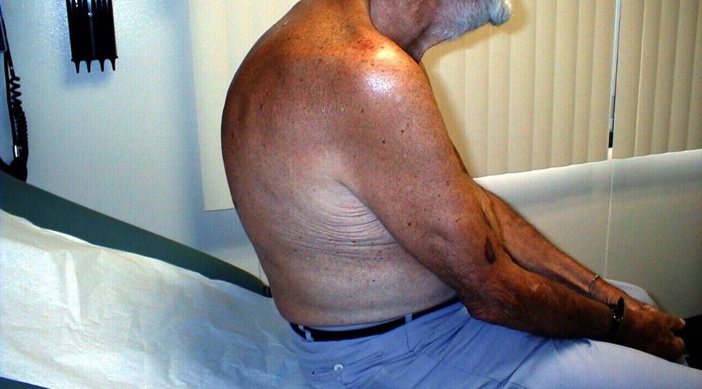 У больного при отсутствии лечения на месте повреждения грудного позвонка формируется кифосколиотическая деформация позвоночного столба.