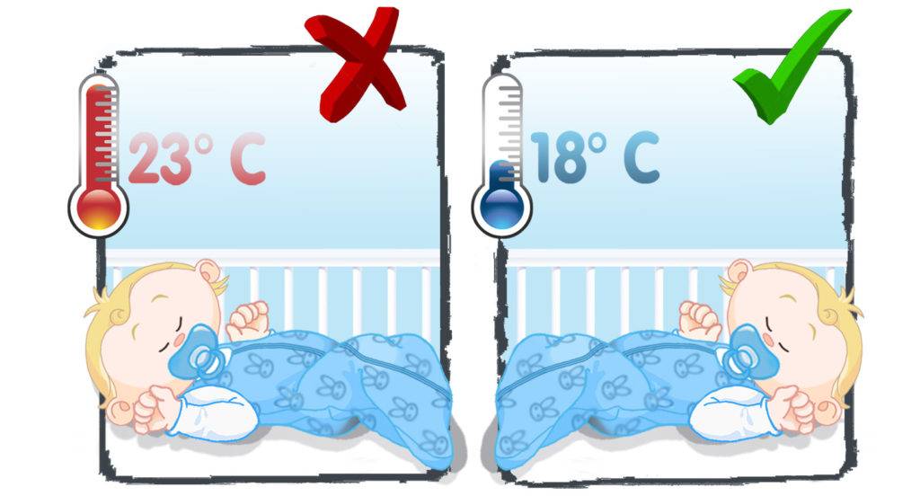 - В помещении, где спит малыш, не должно быть жарко и душно. Приемлемая температура — 18-22 градусов.