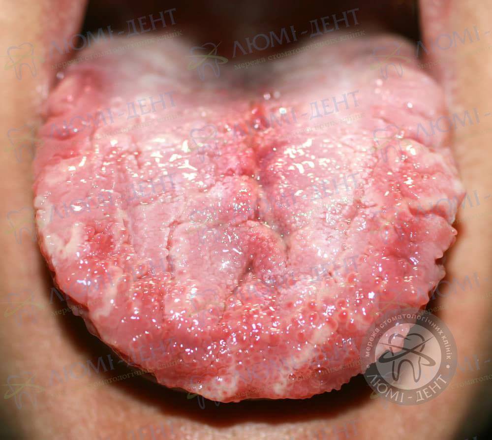 - клинически заболевание выражается покраснением определенных участков слизистой.