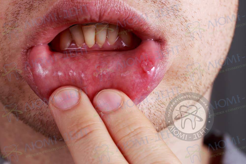 Что такое стоматит — это заболевание, которое проявляется появлением на слизистой оболочке полости рта — на языке, стоматит на губах, щеках, небе — «пузырей», небольших язв во рту, ранок, афт, язвочек, вавок, эрозий и других не менее неприятных и болезненных новообразований — вот основные симптомы стоматита.