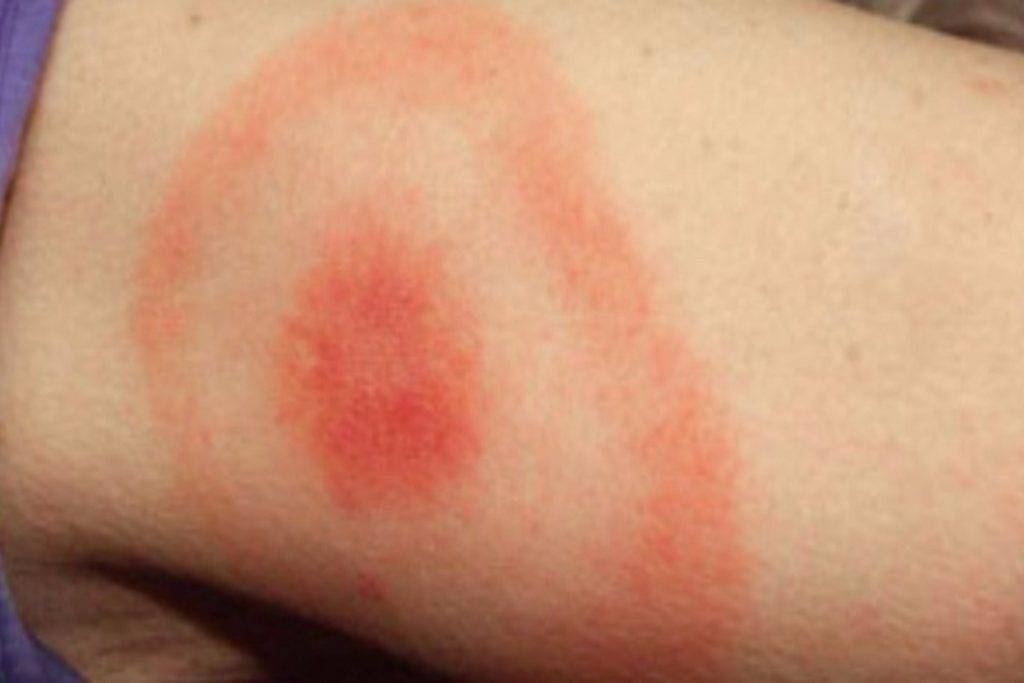 При боррелиозе в месте укуса образуется эритема (сыпь в виде кругов), которая способна перемещаться по телу и вырастать в размере до 60 см. Эритематозное высыпание способно вызывать боль, жжение, цианоз кожных покровов и отечность. По ощущениям температура пятна ощутимо выше окружающей кожи. Другие признаки можно спутать с гриппом – это повышение температуры, вялость, головные боли и боль в мышцах. Реже появляются дискомфорт в животе, бессонница, нарушение слухового восприятия.
