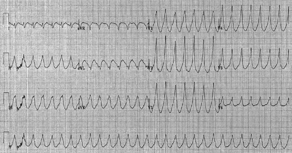Фибрилляция желудочков (ФЖ). Часто является осложнением обширного трансмурального инфаркта миокарда или продолжением развития пароксизмальной желудочковой тахикардии, хотя некоторые ученые рассматривают фибрилляцию желудочков и желудочковую тахикардию как одно явление. Характеризуется хаотичным и нерегулярным сокращением сердечной мышцы на уровне от 250 до 600 ударов в минуту, что в некоторых случаях приводит к полной остановке сердца. Кроме того, уже через 15-20 секунд больной может испытать сильное головокружение и потерять сознание, а через 40 секунд у него может произойти однократная тоническая судорога скелетных мышц, сопровождающаяся непроизвольным мочеиспусканием и дефекацией. В это же время, у пострадавшего увеличиваются в размерах зрачки, которые через полторы-две минуты расширены до максимального уровня. Больной начинает быстро дышать, но после дыхание замедляется, и через 2 минуты наступает клиническая смерть.