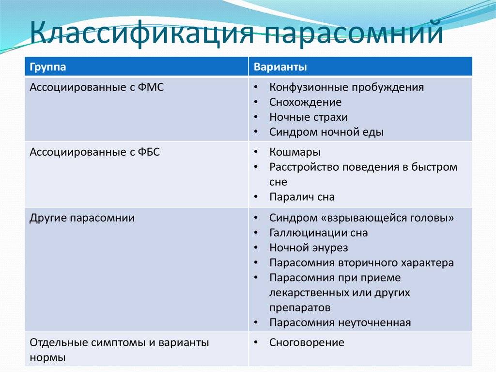 Одна из классификаций представлена в Международном классификаторе расстройств сна. Согласно ней парасомнии разделяют на следующие: