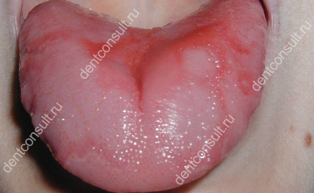 Первичными симптомами недуга является дискомфорт и жжение. Вскоре появляется сильное покраснение языка, усиление слюноотделения, притупление (отсутствие) вкусовых ощущений.