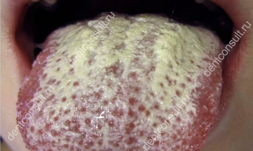 - катаральный (отечность всей слизистой полости рта и языка, боль во время приема пищи, характерный желтый налет на небе деснах, языке);