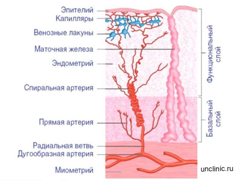 Матка изнутри выстлана слизистым слоем, называемым эндометрием. Его основу составляет железистый (цилиндрический) эпителий, лежащий на соединительной ткани. Внутри эндометрия находятся маточные железы – крипты, представляющие собой трубчатые структуры, открывающиеся в просвет органа и выделяющие слизь для смазки поверхности матки. В этом слое также находятся кровеносные сосуды.
